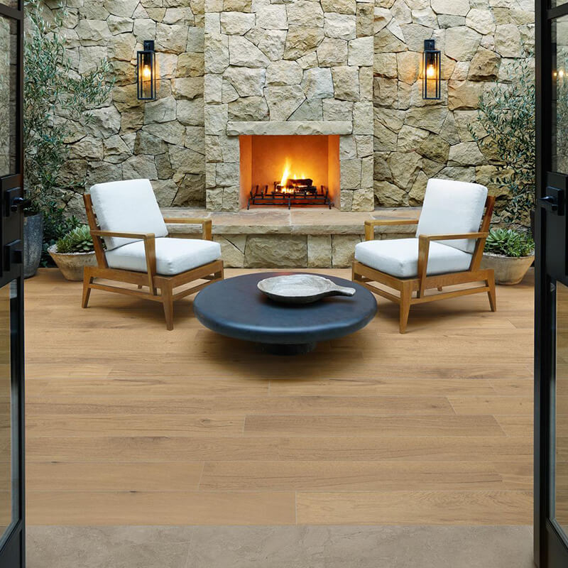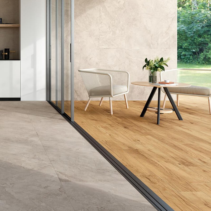 此系列採用抗菌技術製造, 以大理石為靈感的地板和牆面石材可以與木紋磚自由組合。木紋磚表面觸感柔順、易於清潔、防滑表面,使其成為室內和室外雅緻、舒適優雅的理想建材。