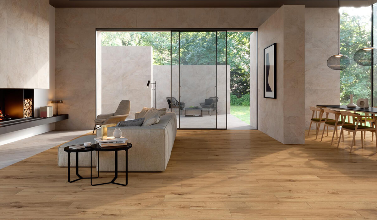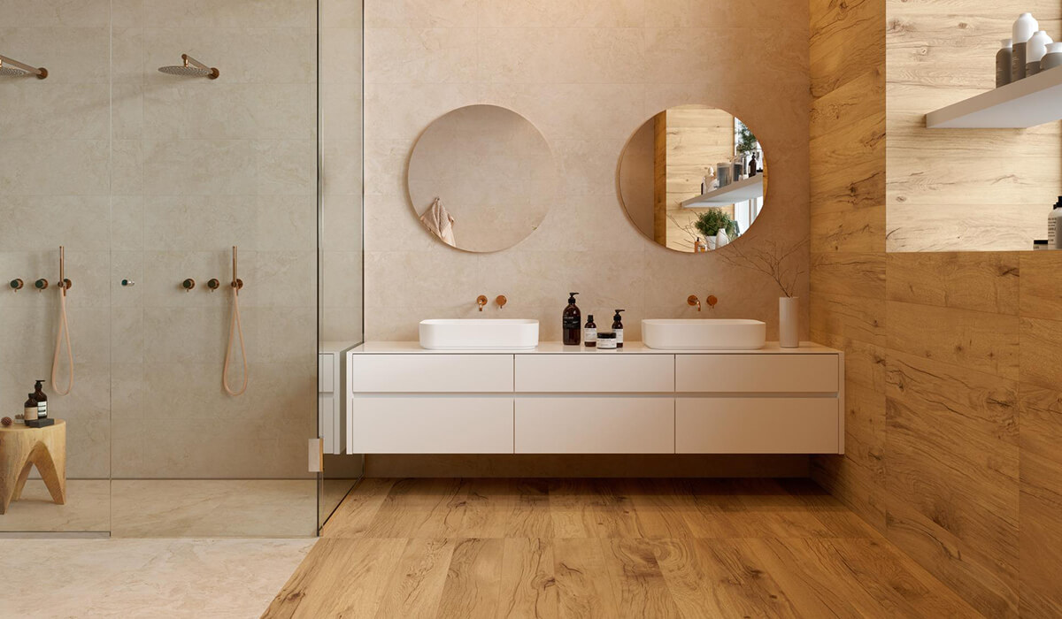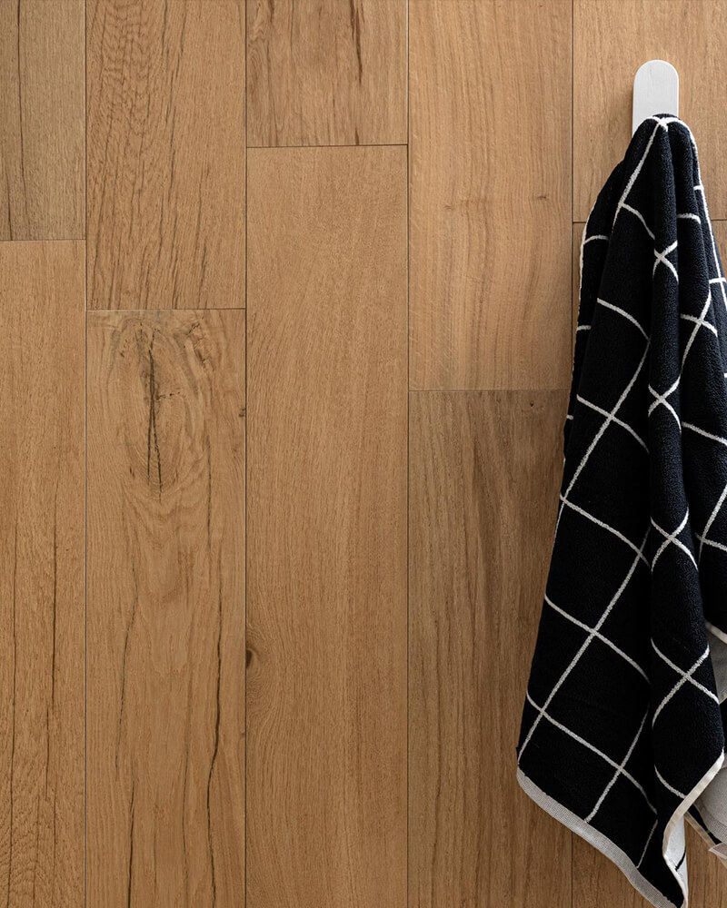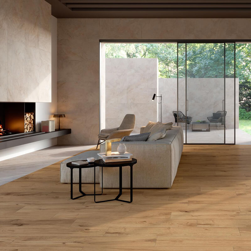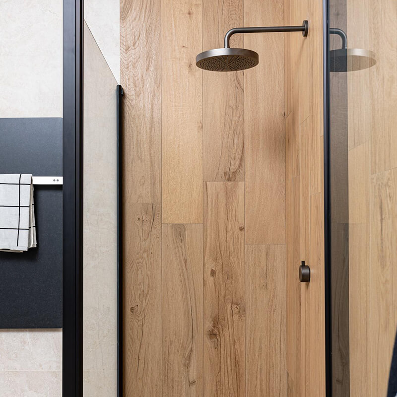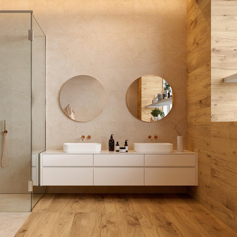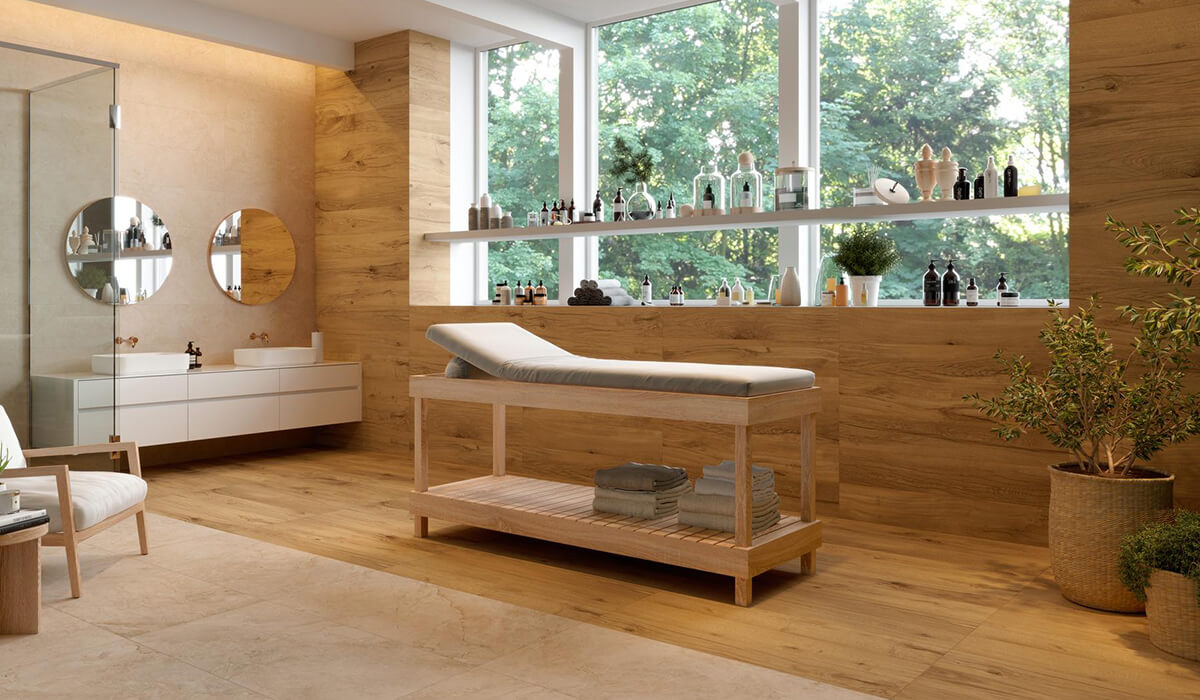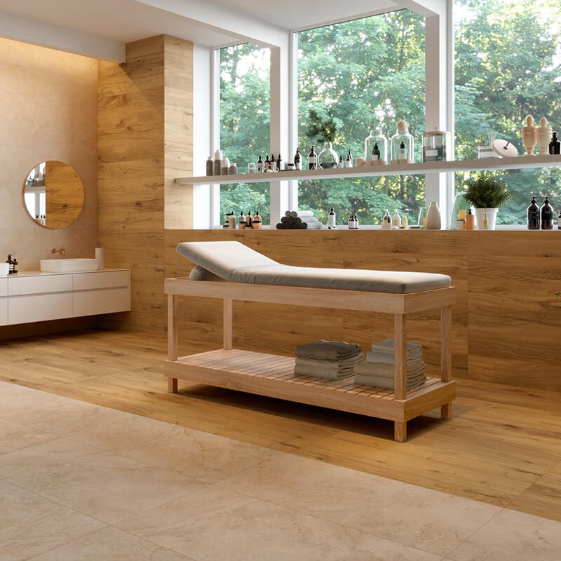 此系列採用抗菌技術製造, 以大理石為靈感的地板和牆面石材可以與木紋磚自由組合。木紋磚表面觸感柔順、易於清潔、防滑表面,使其成為室內和室外雅緻、舒適優雅的理想建材。